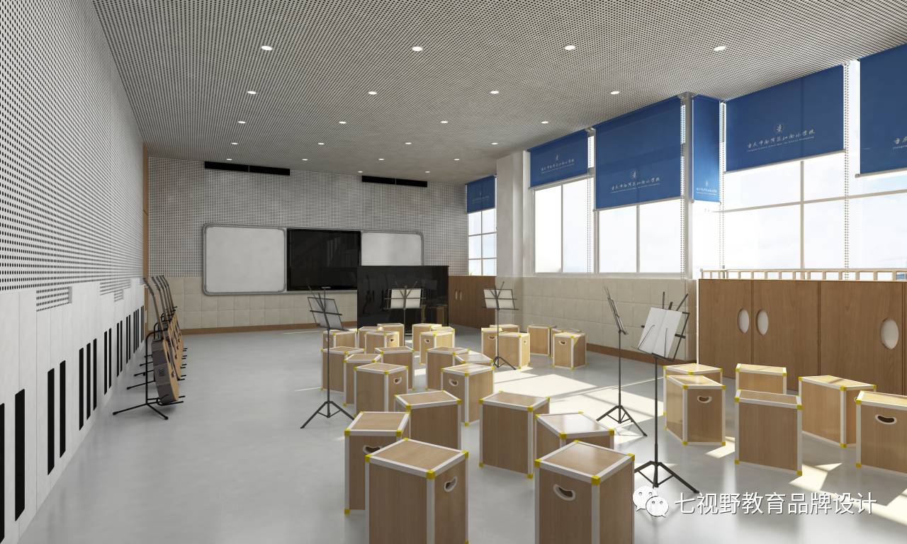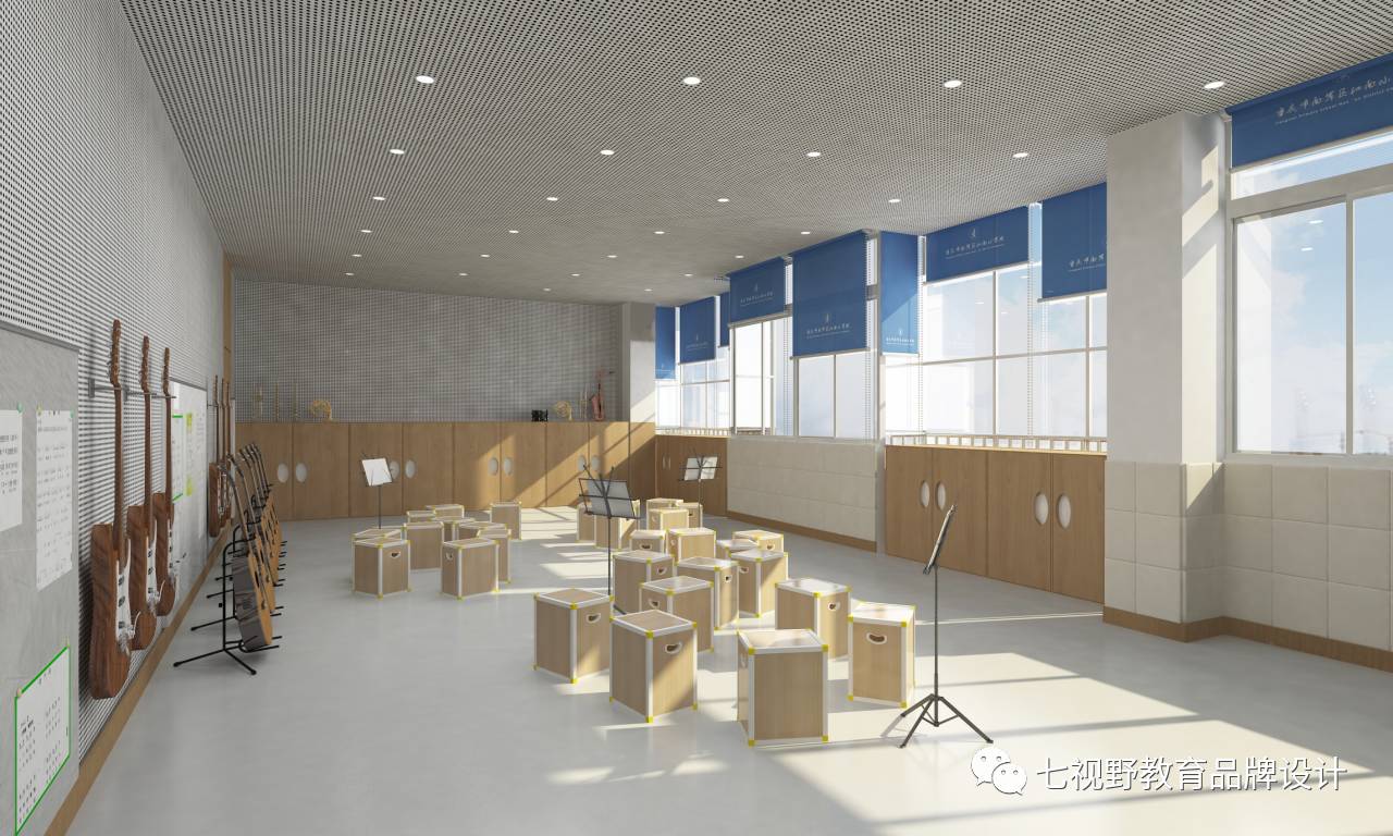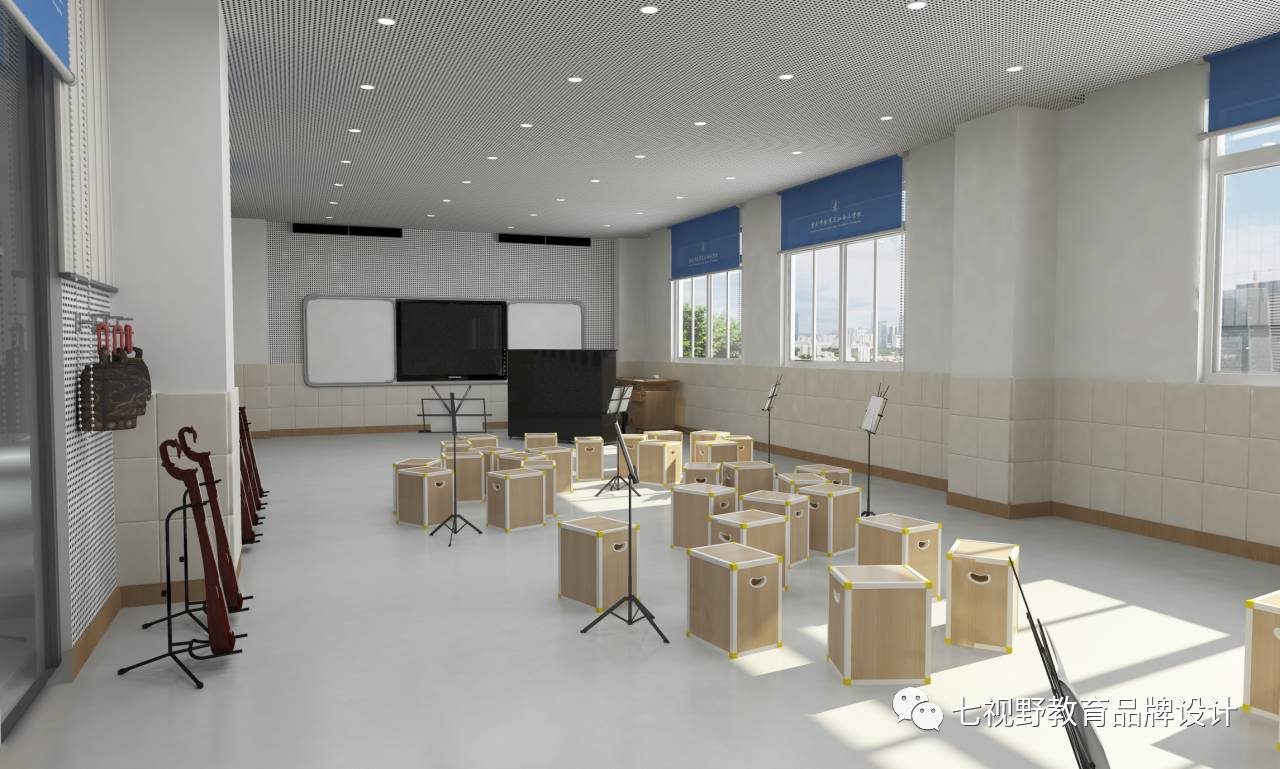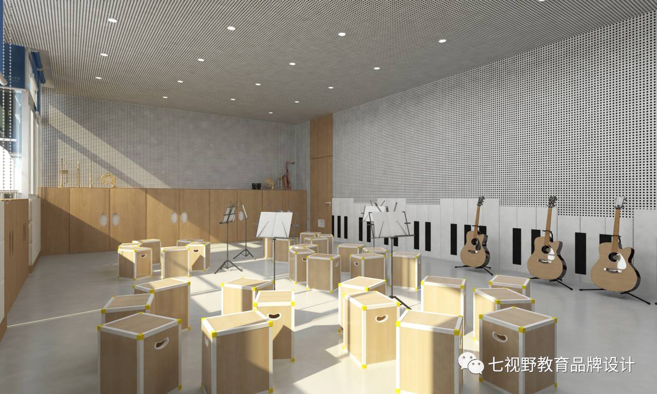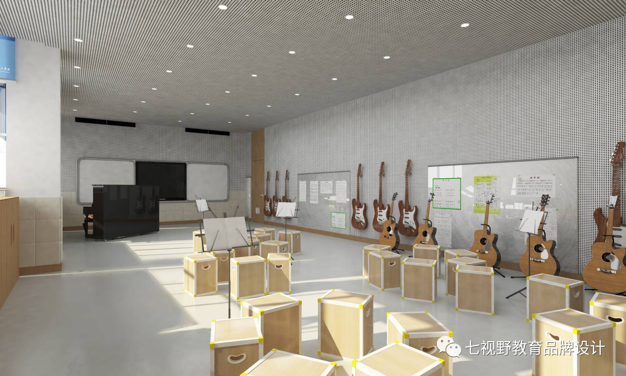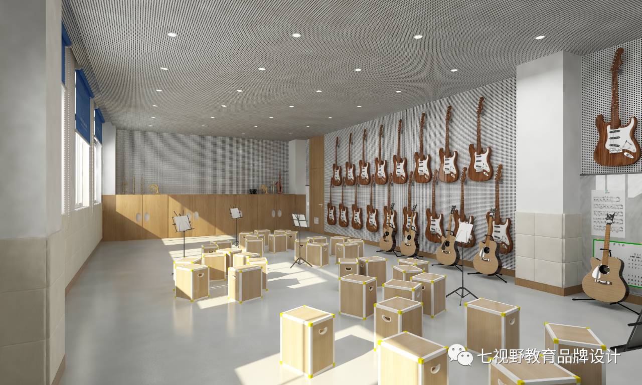 在一些墙面的设计上采用了乐器实物摆放的形式,可以让学生在课余时间自己去了解学习乐器,在墙面还设置了磁性白板,可以用作展示学生作品和上课教学,在空间内还设置了多功能储物柜,可供师生摆放乐器、展品和学生储物。