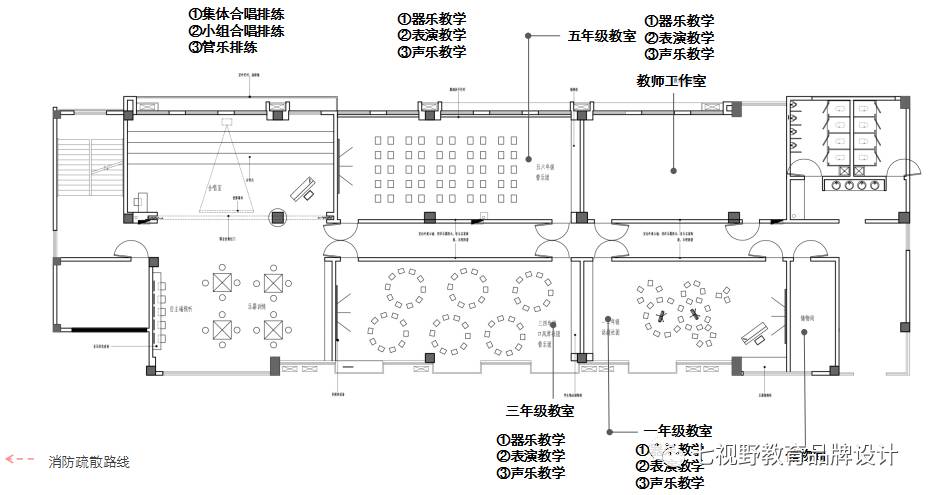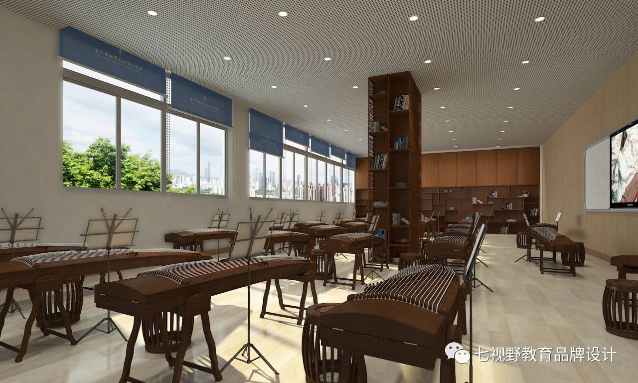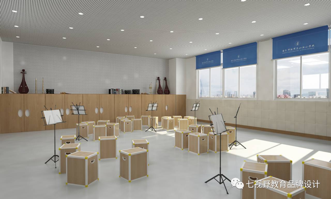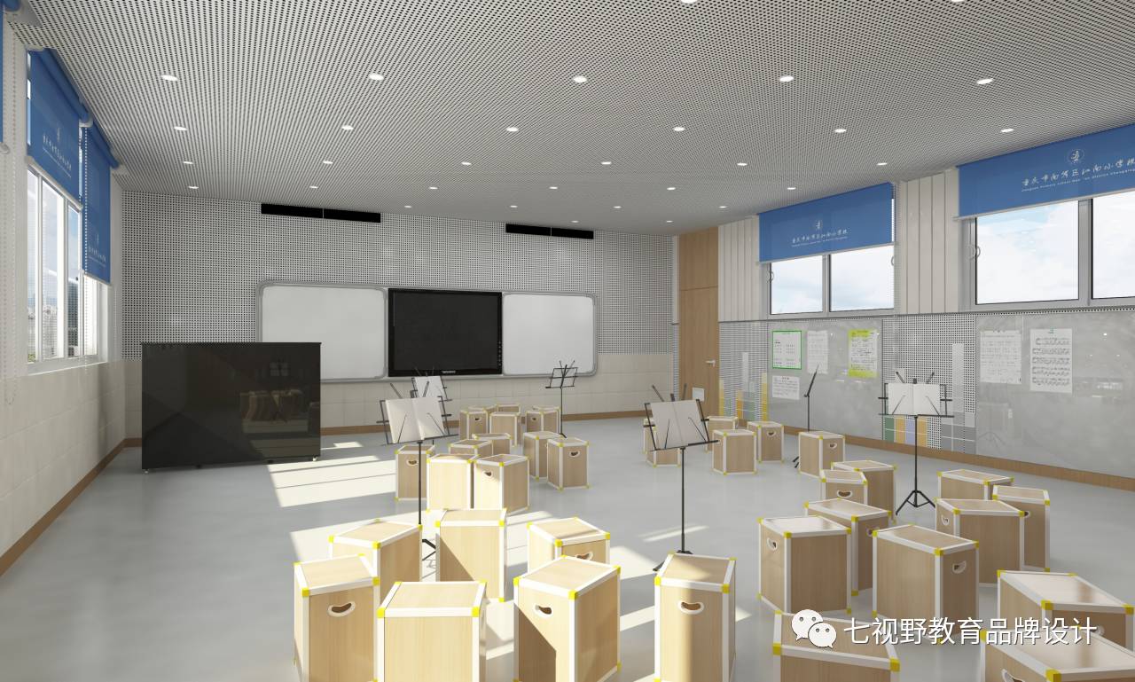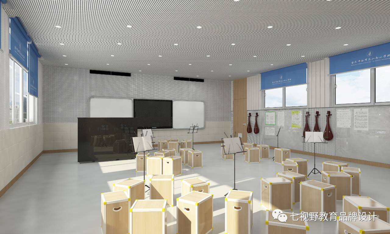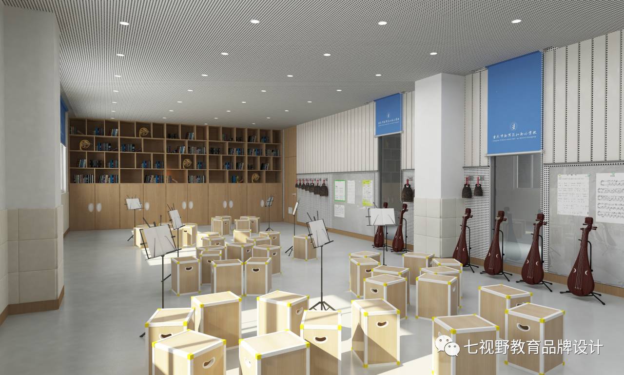 在一些墙面的设计上采用了乐器实物摆放的形式,可以让学生在课余时间自己去了解学习乐器,在墙面还设置了磁性白板,可以用作展示学生作品和上课教学,在空间内还设置了多功能储物柜,可供师生摆放乐器、展品和学生储物。