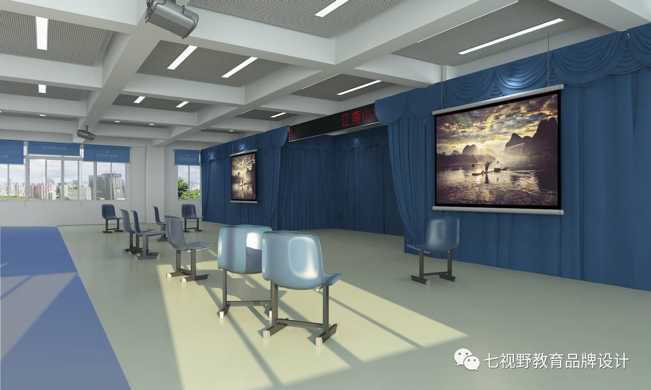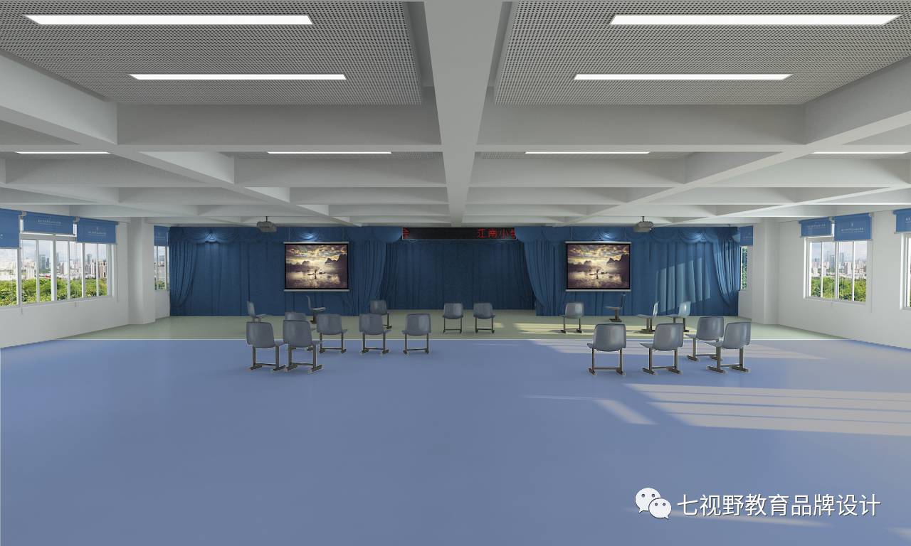 音乐中心的多功能厅把原有舞台背景墙拆除,两柱子之间的舞台后墙往后移2米,采用活动幔帘做舞台背景,两边没有了固化的边沿,使前部分全是舞台,形成多重舞台形式,丰富了舞台空间,可以根据不同需要多变舞台的空间形式;观席区域也采用空旷形式,摆放活动座椅,可以灵活使用空间;天花用吸音穿孔板做梁井内局部吊顶,和梁很好的结合。