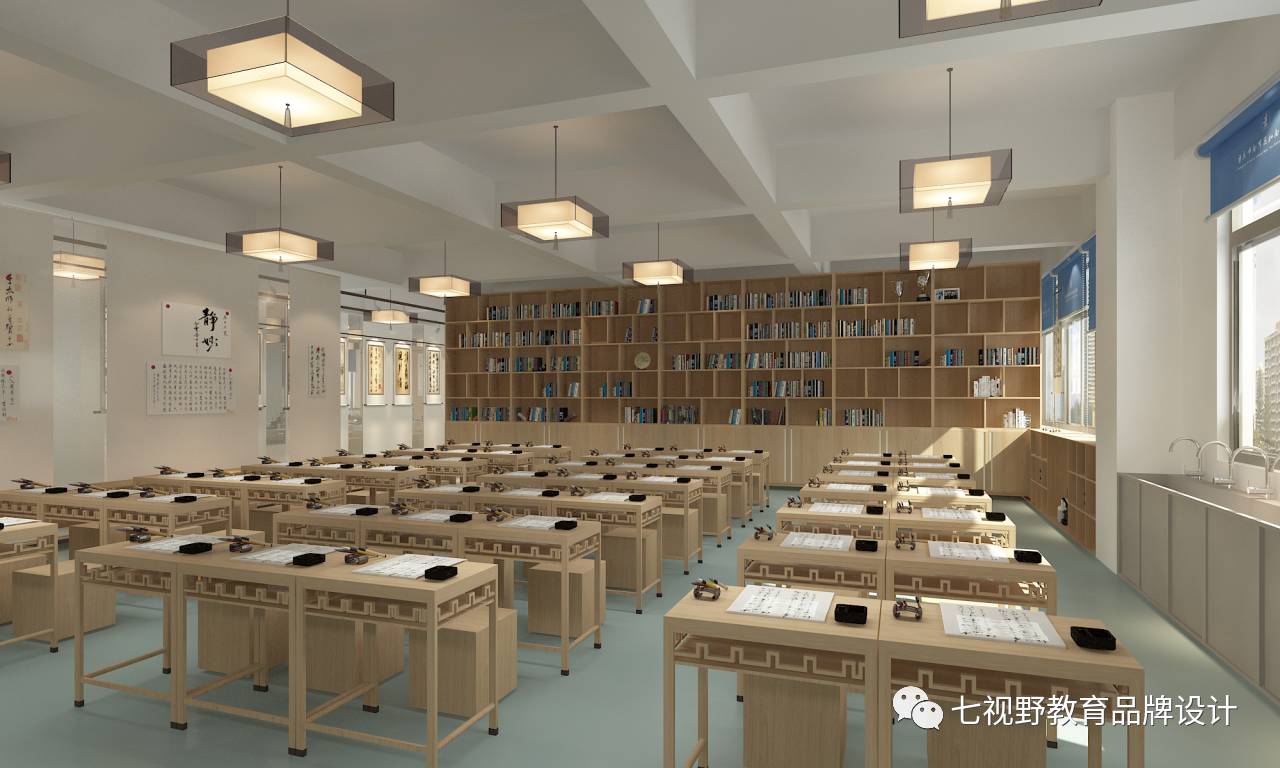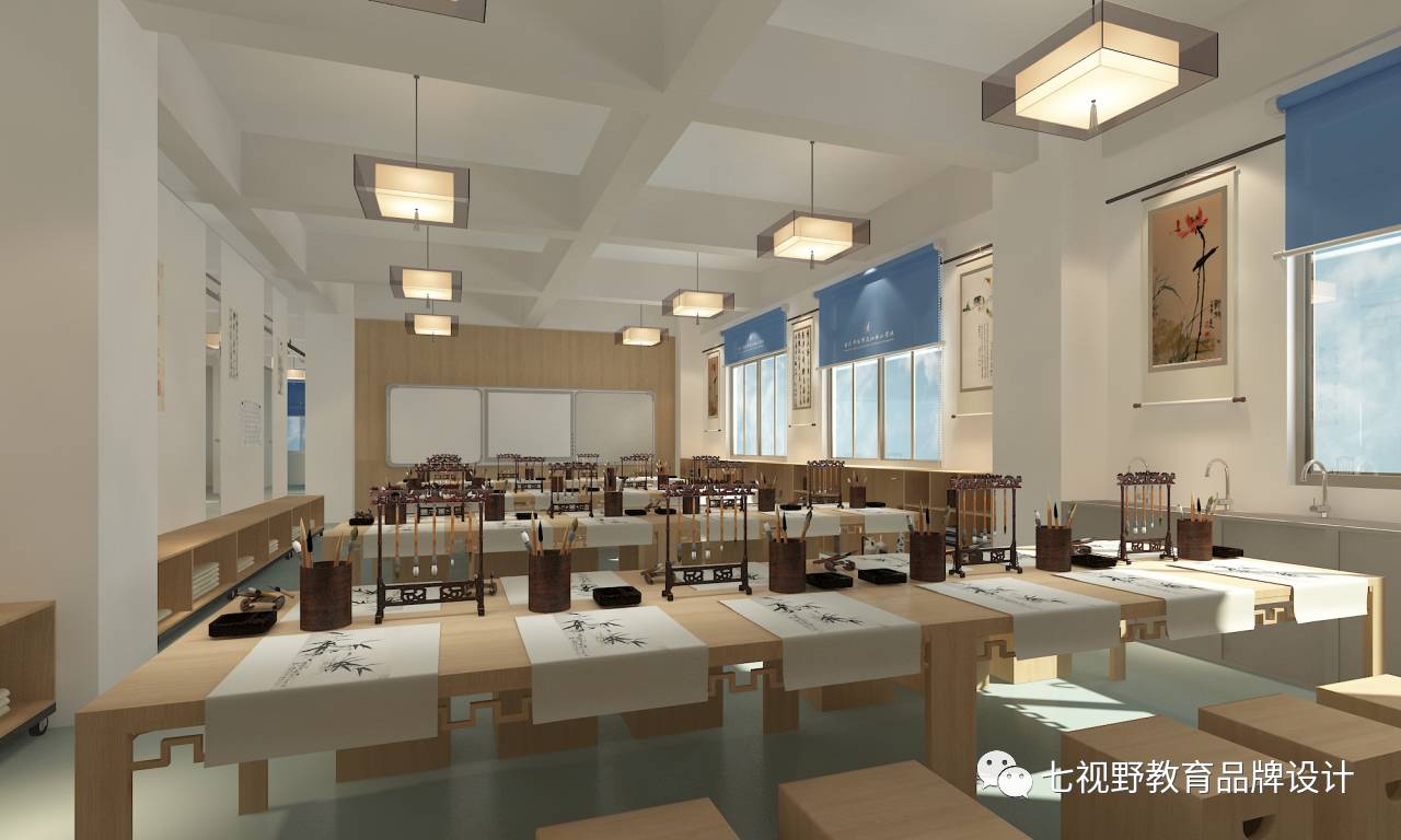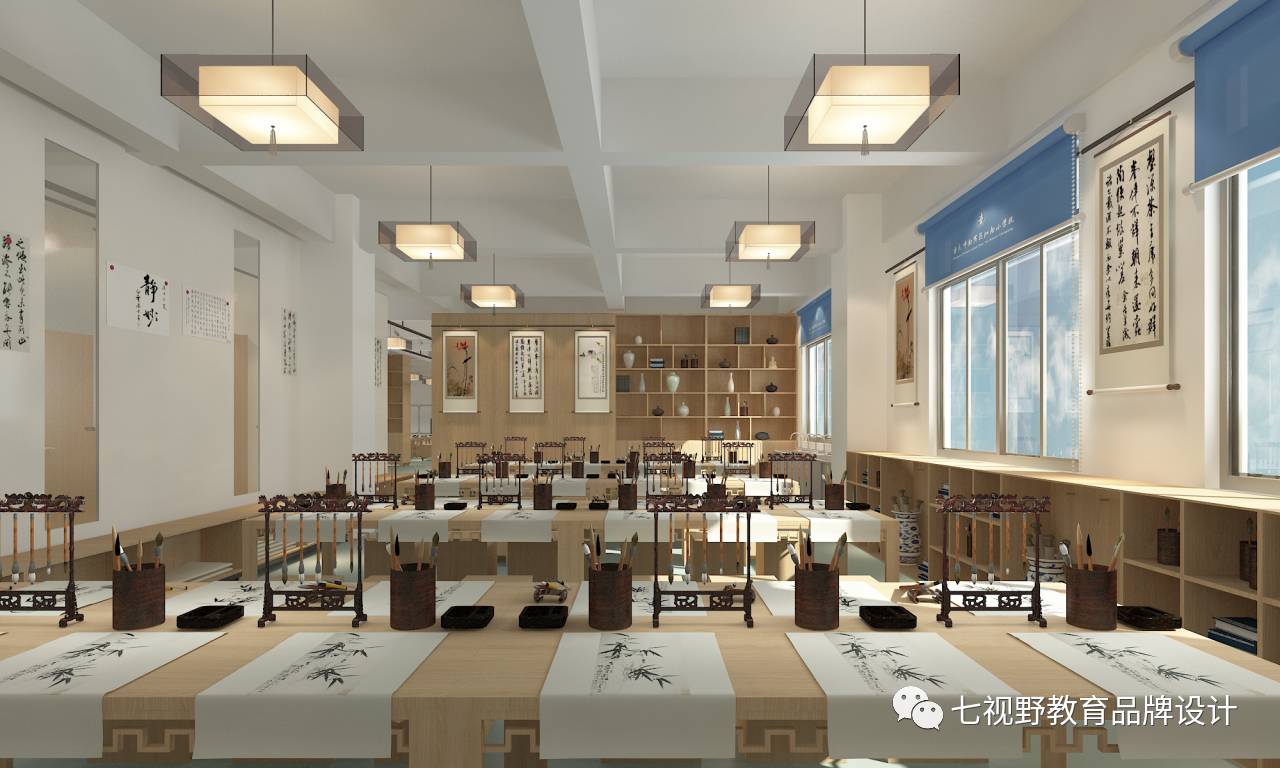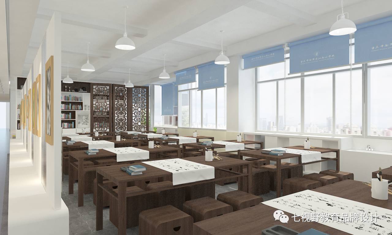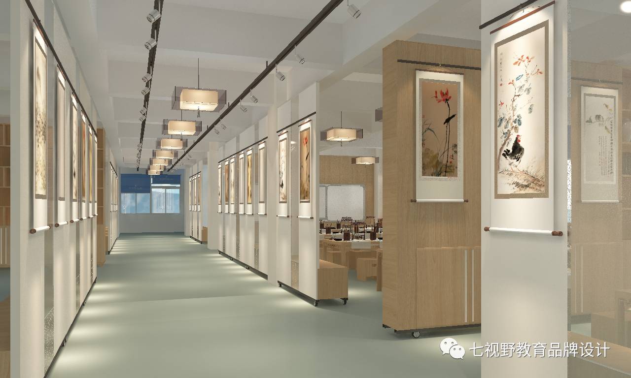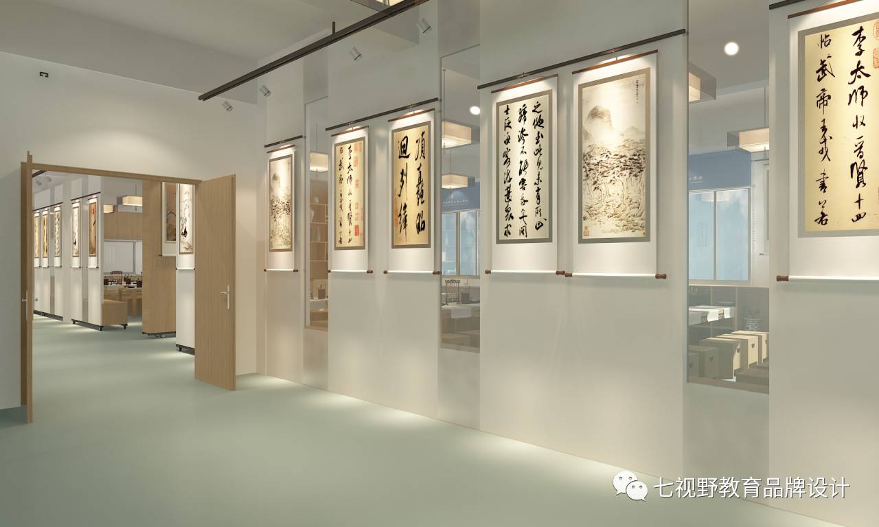走廊区域整体呈直线造型,在两侧的柜体上展示美术名画,既美观又不影响空间使用,柜体另一个可以进行储物和学生休息。整体空间颜色偏暖,加入了大量的美术书法元素,让学生在周围环境的影响之下更好的学习。